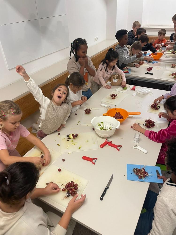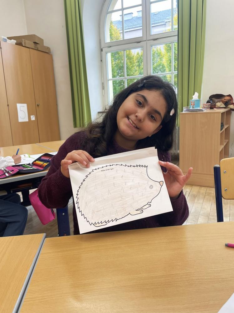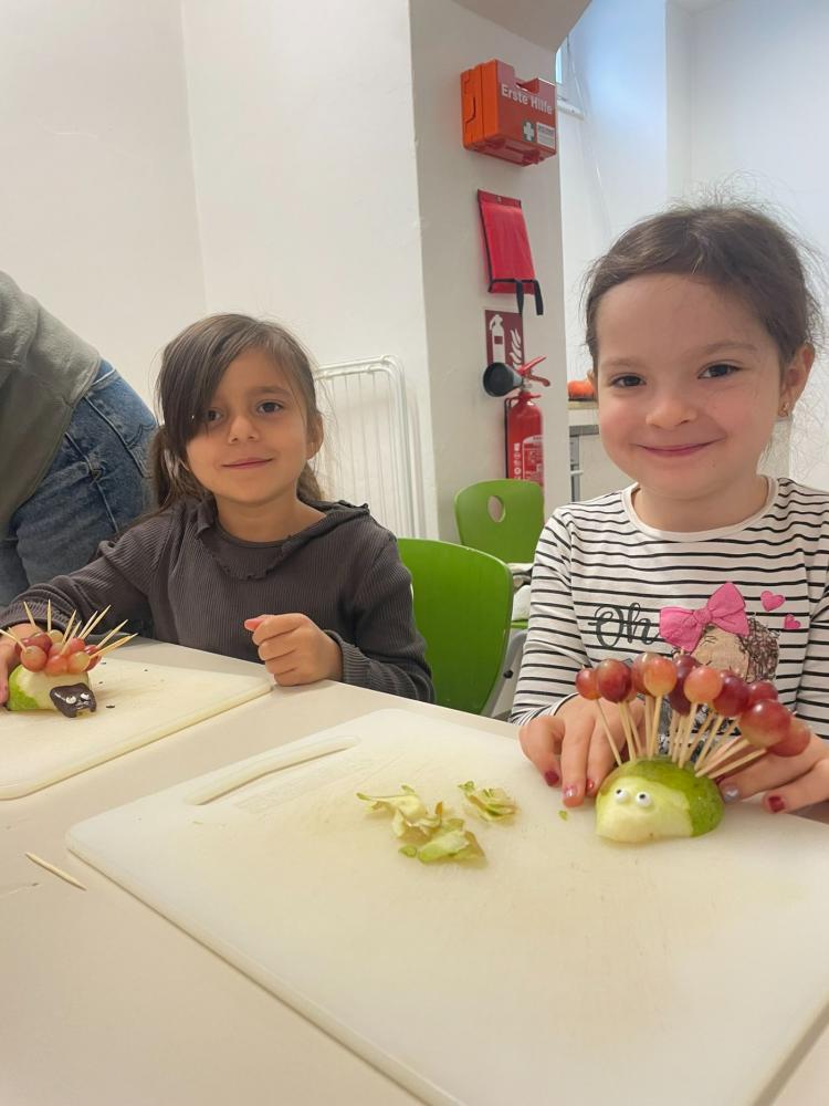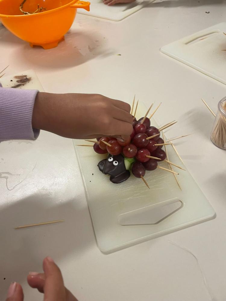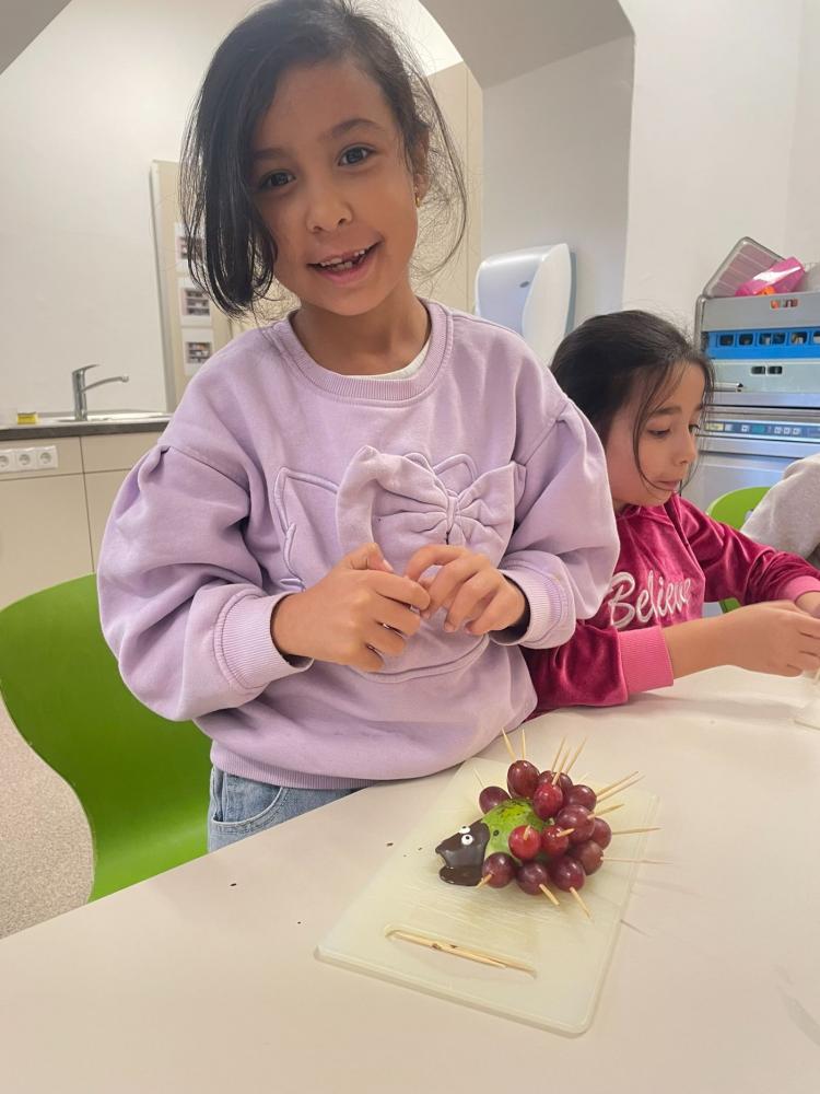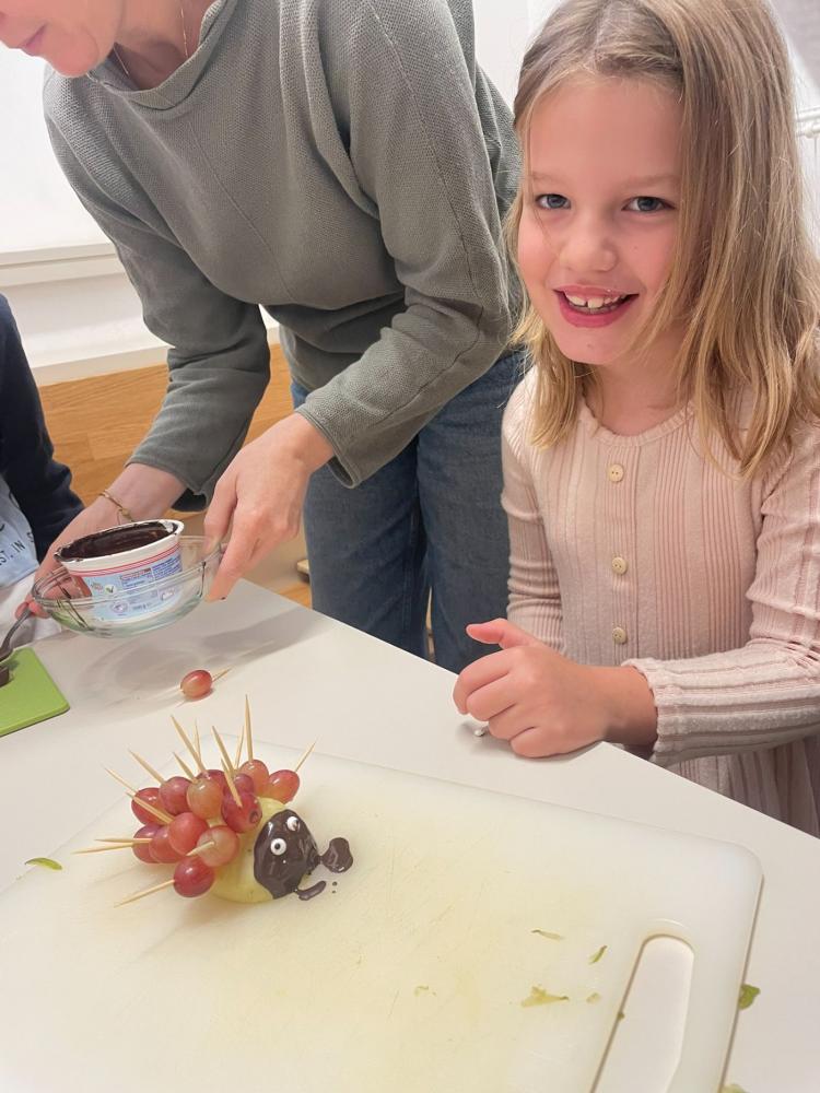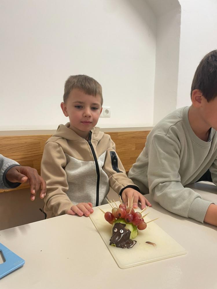 Was frisst ein Igel? Was sind die größten Gefahren für einen Igel? Wie viele Stacheln hat ein Igel und wie sieht eigentlich ein Igelbaby aus? Die 1a ging diesen Fragen auf die Spur und stattete im Zuge dessen der Schulküche zum ersten Mal einen Besuch ab. Dort kreierte jedes Kind seinen individuellen Birnenigel, welcher mit Zahnstochern, Trauben und Schokolade komplettiert wurde. Danach ließen wir uns die Stacheltiere natürlich auch noch schmecken!
