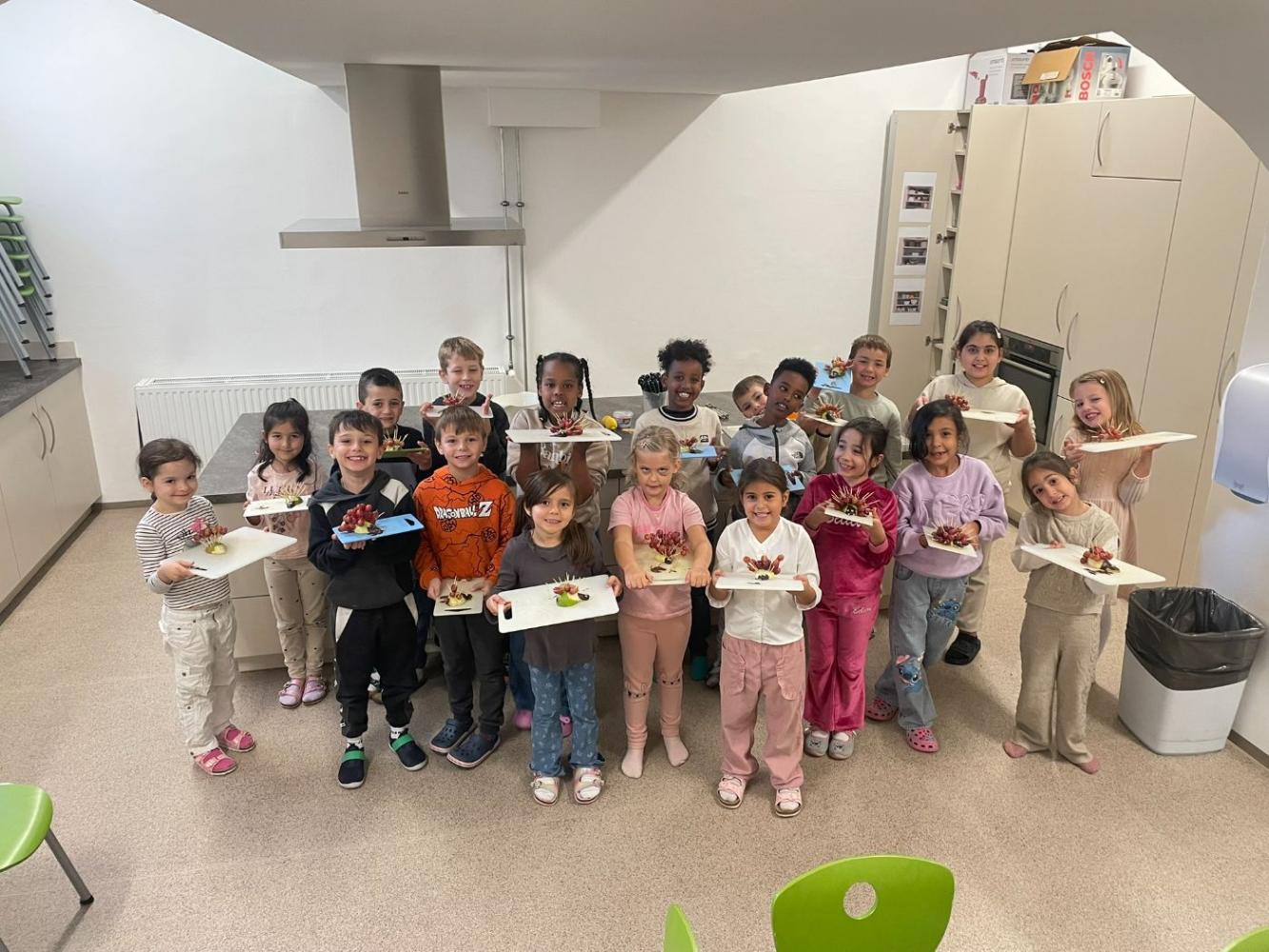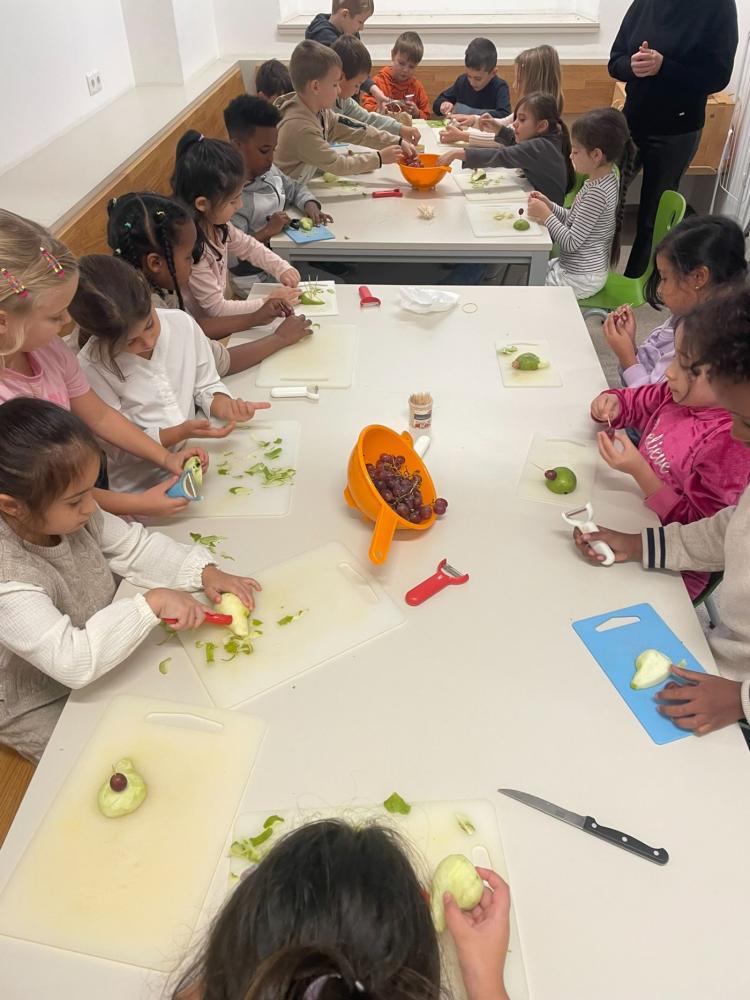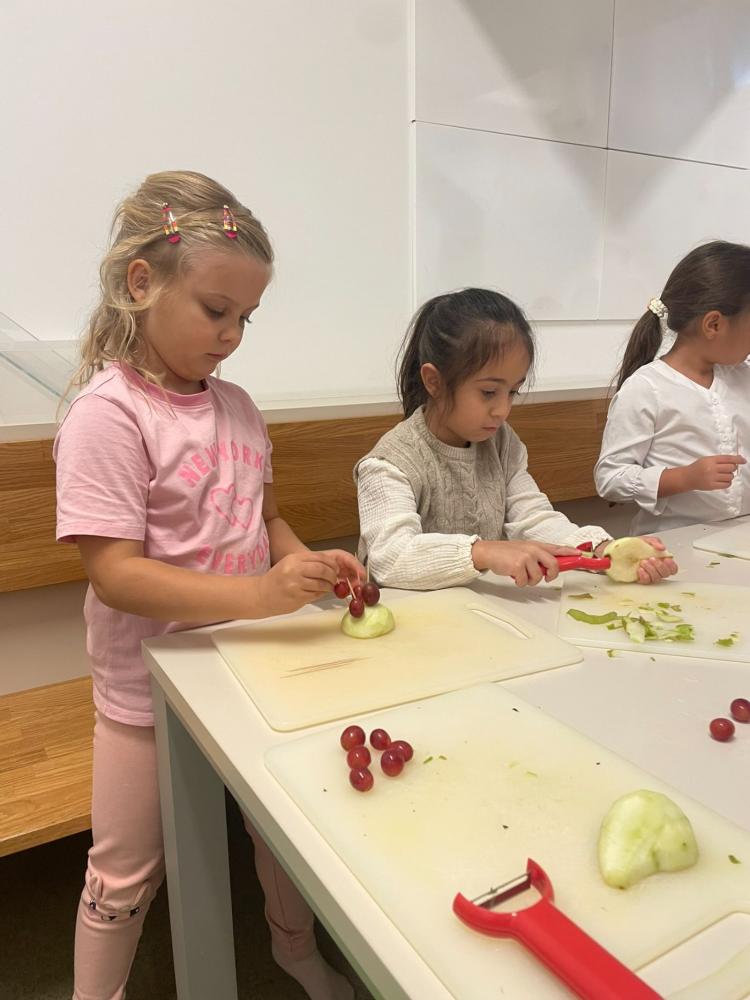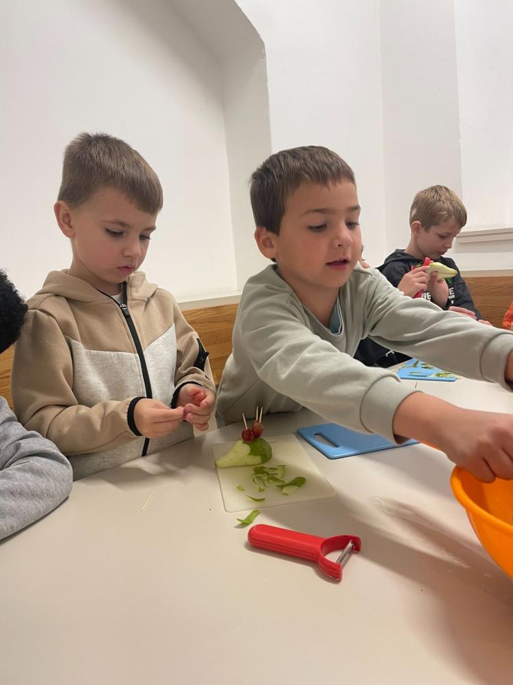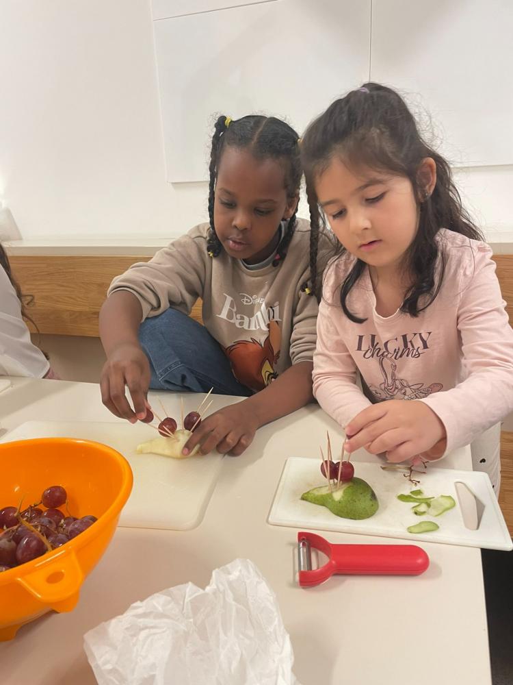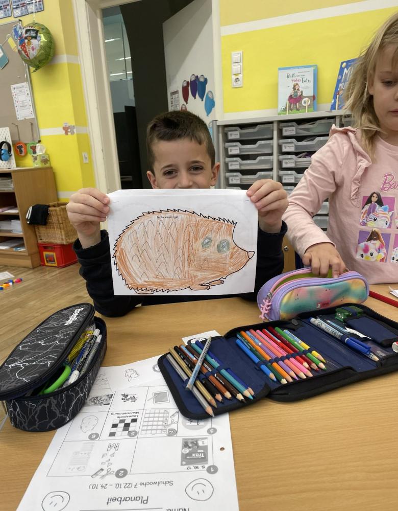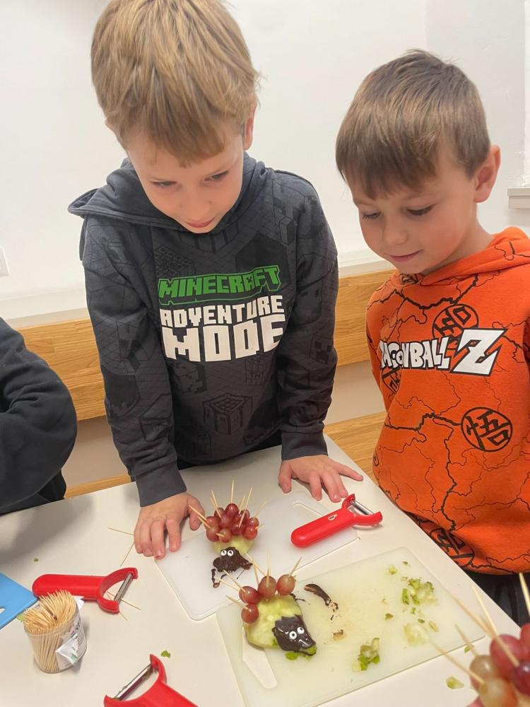 Was frisst ein Igel? Was sind die größten Gefahren für einen Igel? Wie viele Stacheln hat ein Igel und wie sieht eigentlich ein Igelbaby aus? Die 1a ging diesen Fragen auf die Spur und stattete im Zuge dessen der Schulküche zum ersten Mal einen Besuch ab. Dort kreierte jedes Kind seinen individuellen Birnenigel, welcher mit Zahnstochern, Trauben und Schokolade komplettiert wurde. Danach ließen wir uns die Stacheltiere natürlich auch noch schmecken!