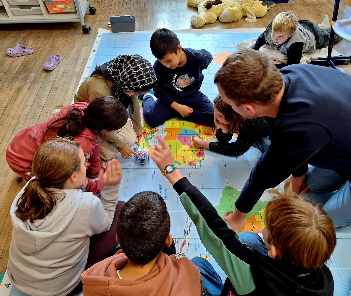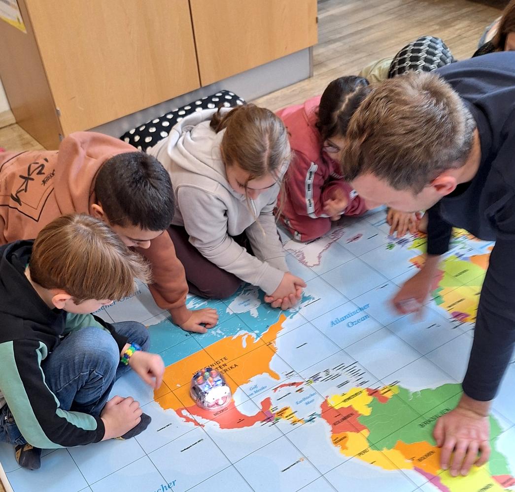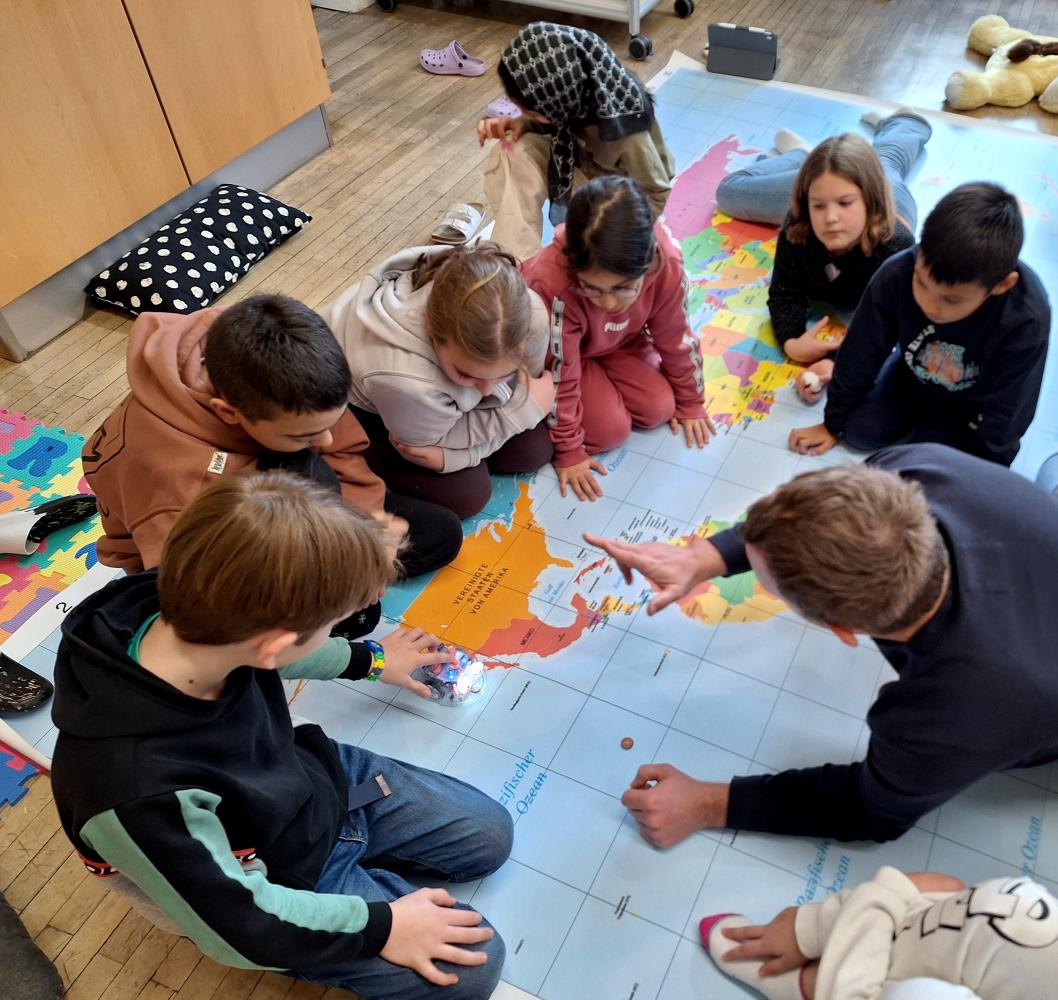 Globales Lernen - Von der Baumwolle zum T-Shirt von Sabrina Mudenda 20. November 2024 Globales Lernen Nach einem Kurzfilm zum Thema "Von der Baumwolle zum T-Shirt" und einer Einführung mit Anschauungsmaterial, hatten die Kids viel Spaß beim Programmieren der Bee-Bots, um die lange Reise der Baumwolle bis zum fertigen Kleidungsstück nachzuvollziehen.