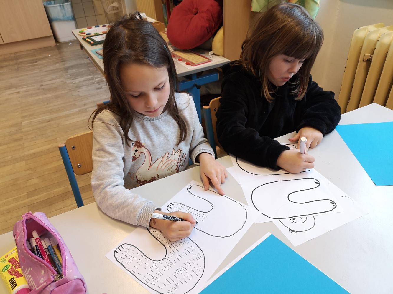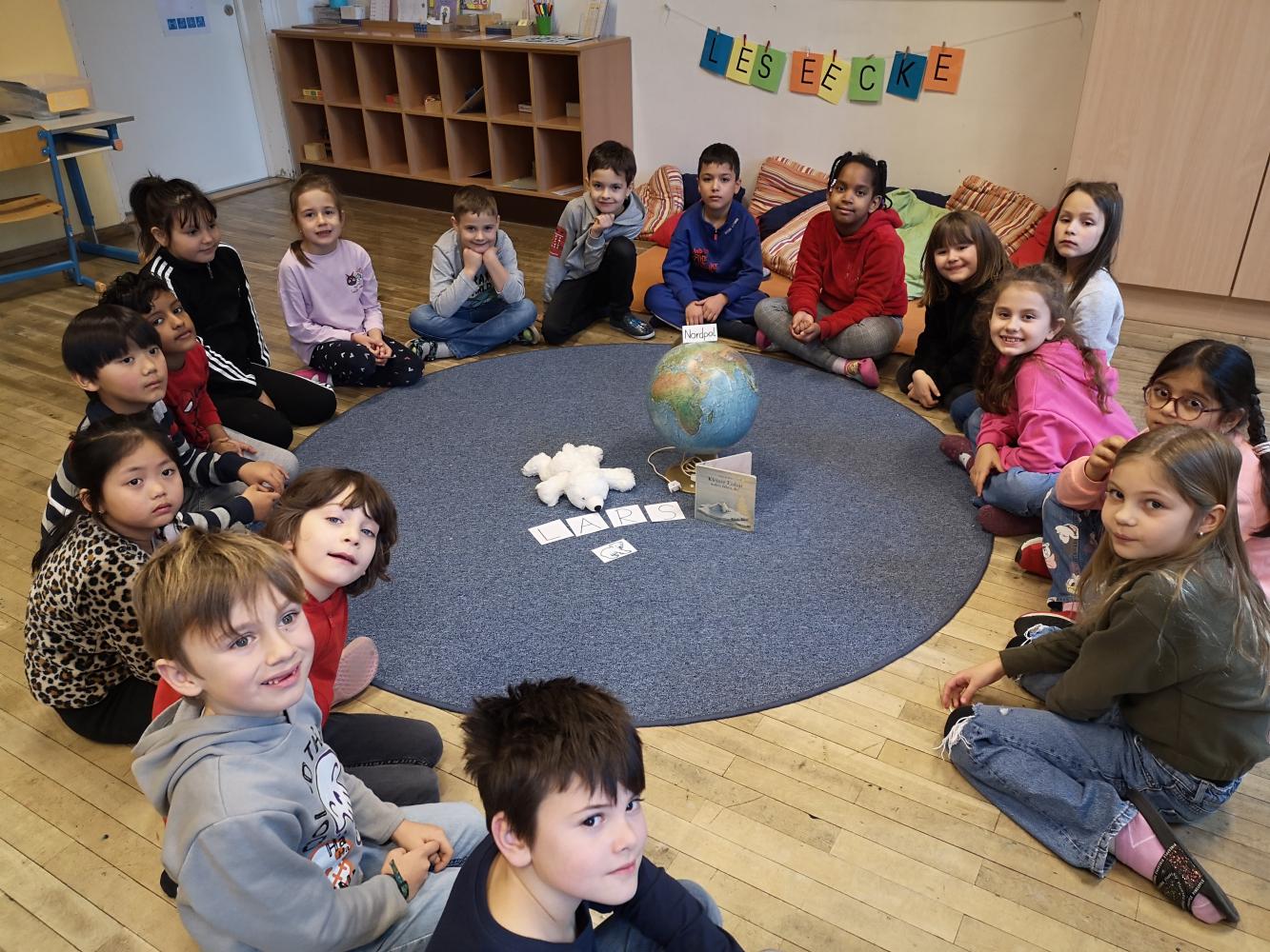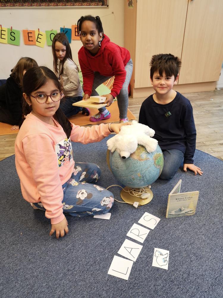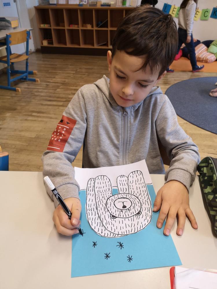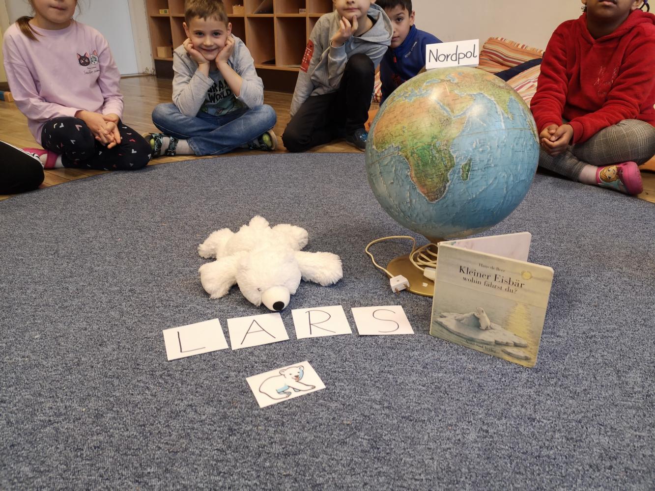 Lars, der kleine Eisbär von Martina Rainer 18. Januar 2023 4b Aufmerksam lauschten die Kinder der 1b der Geschichte von Lars, dem kleinen Eisbären. Danach durften sie Lars mit Filzstift und Schere gestalten.
