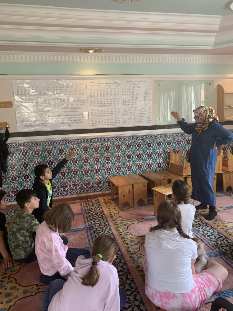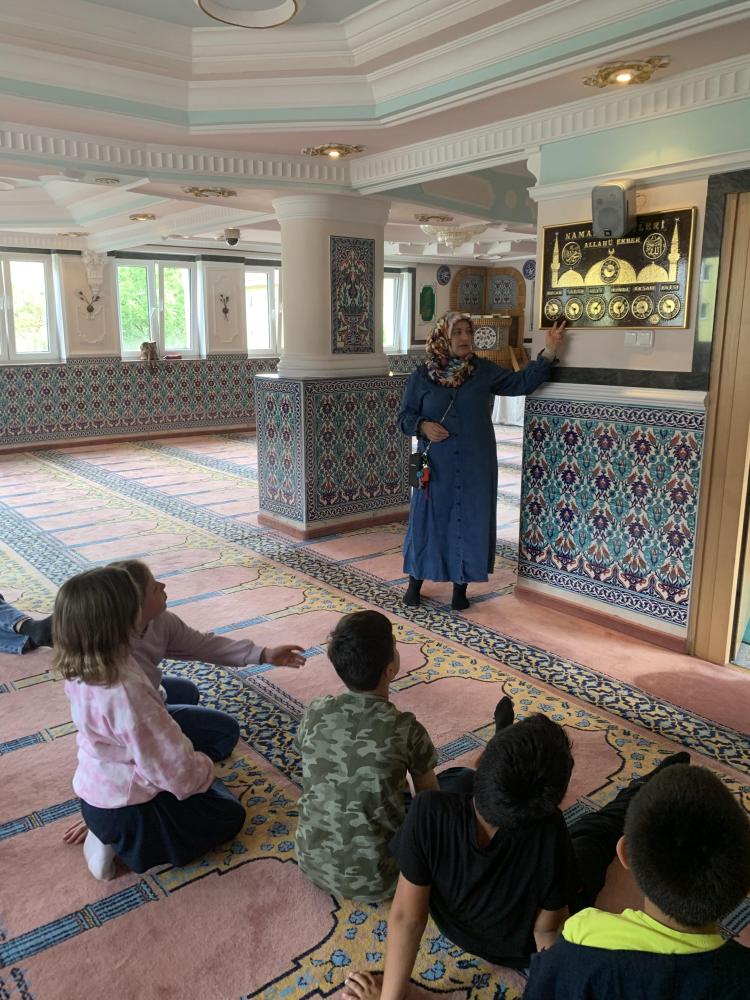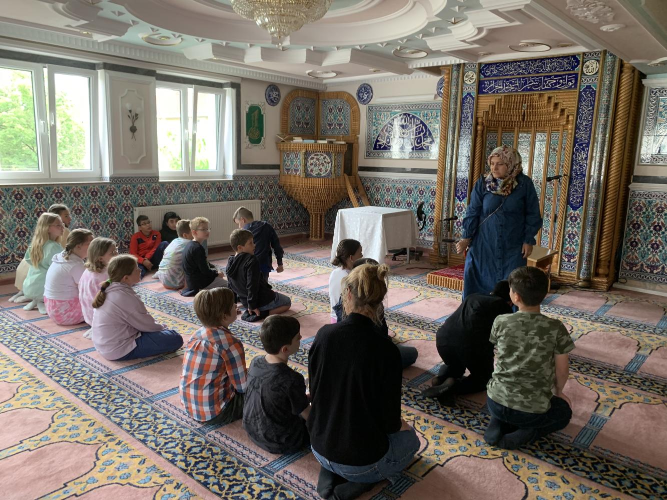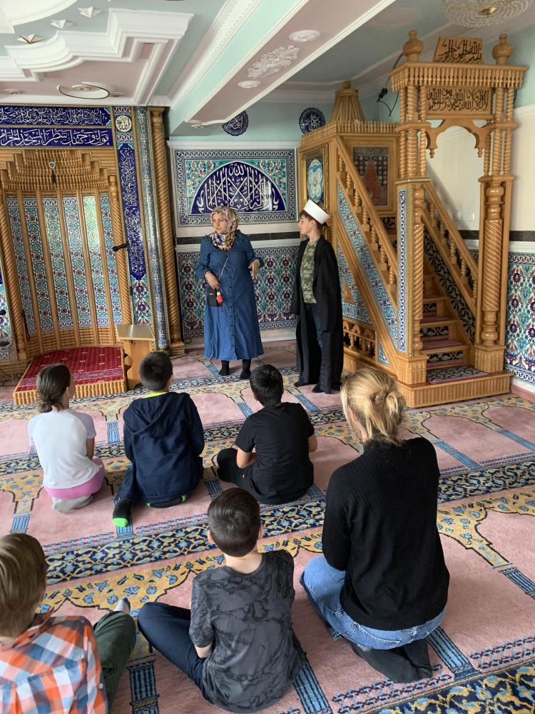 Da das Wissen über andere Religionen zur Allgemeinbildung gehört, besuchten wir (die 4. Klassen) zusammen mit den Religionslehrerinnen Katalin Zach und Yasemin Tuna das Islamische Kulturzentrum mit der Valide Sultan Moschee. Der Gebetsraum mit den schönen Teppichen und der nach Mekka ausgerichteten Gebetsnische (Mihrab) faszinierten die Kinder sehr. Frau Tuna zeigte uns auch, wie Muslime beten und das Studium des Korans mit der arabischen Schrift. Am Schluß erklärte sie uns noch, dass die Moschee nicht nur eine Gebetsstätte, sondern auch eine sozialer Treffpunkt ist.