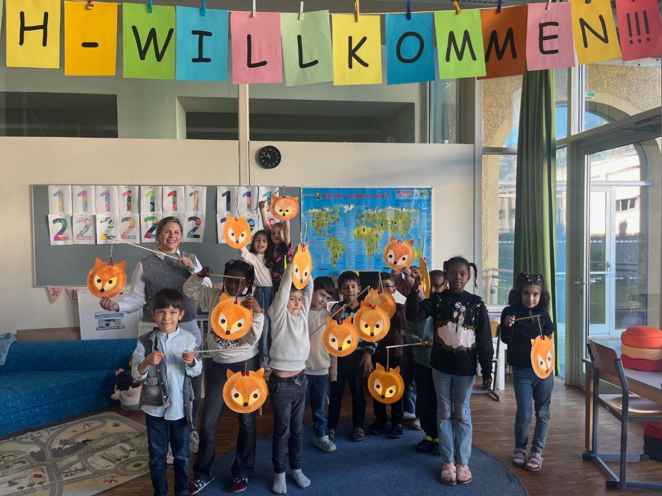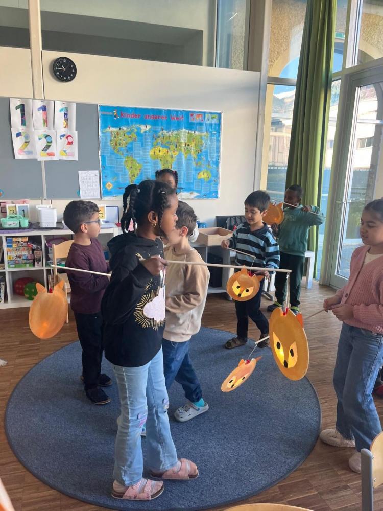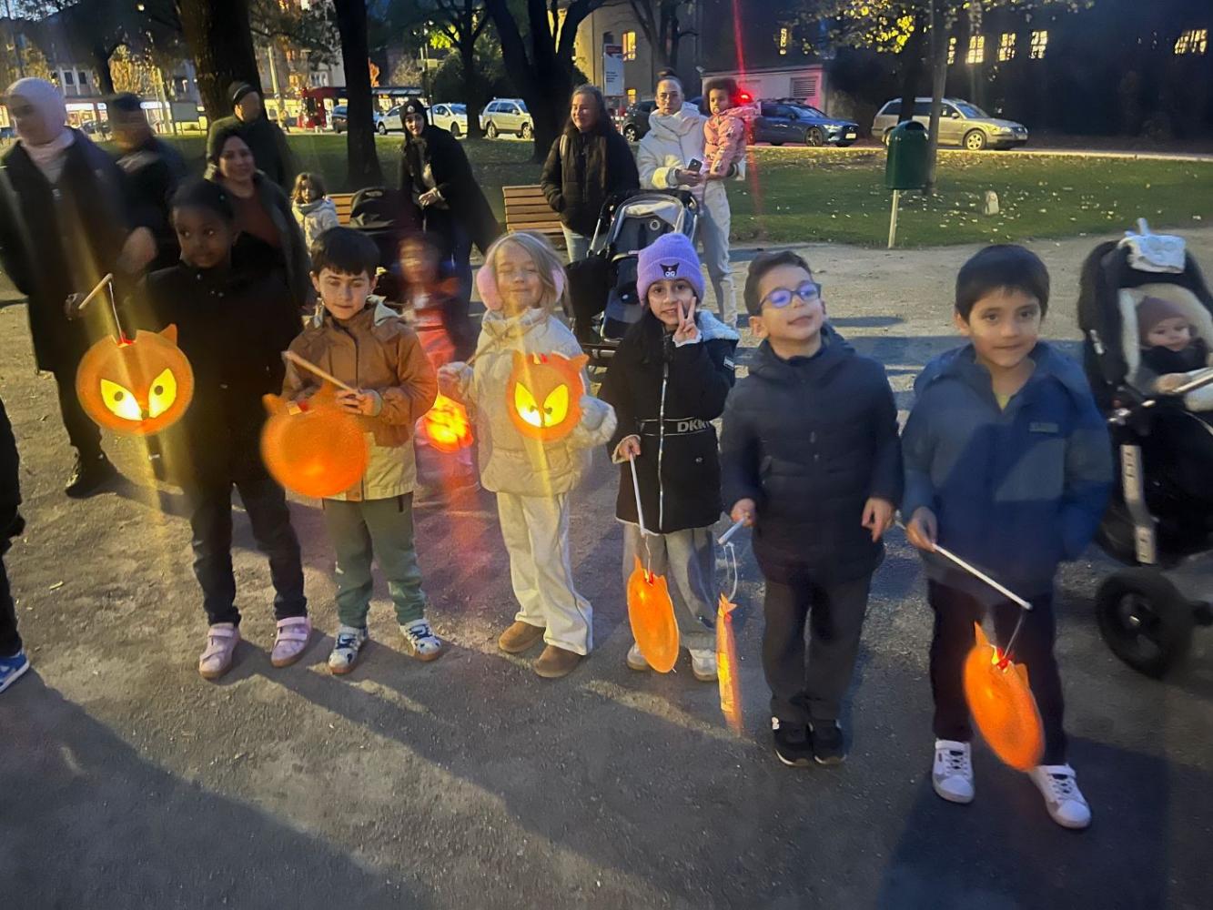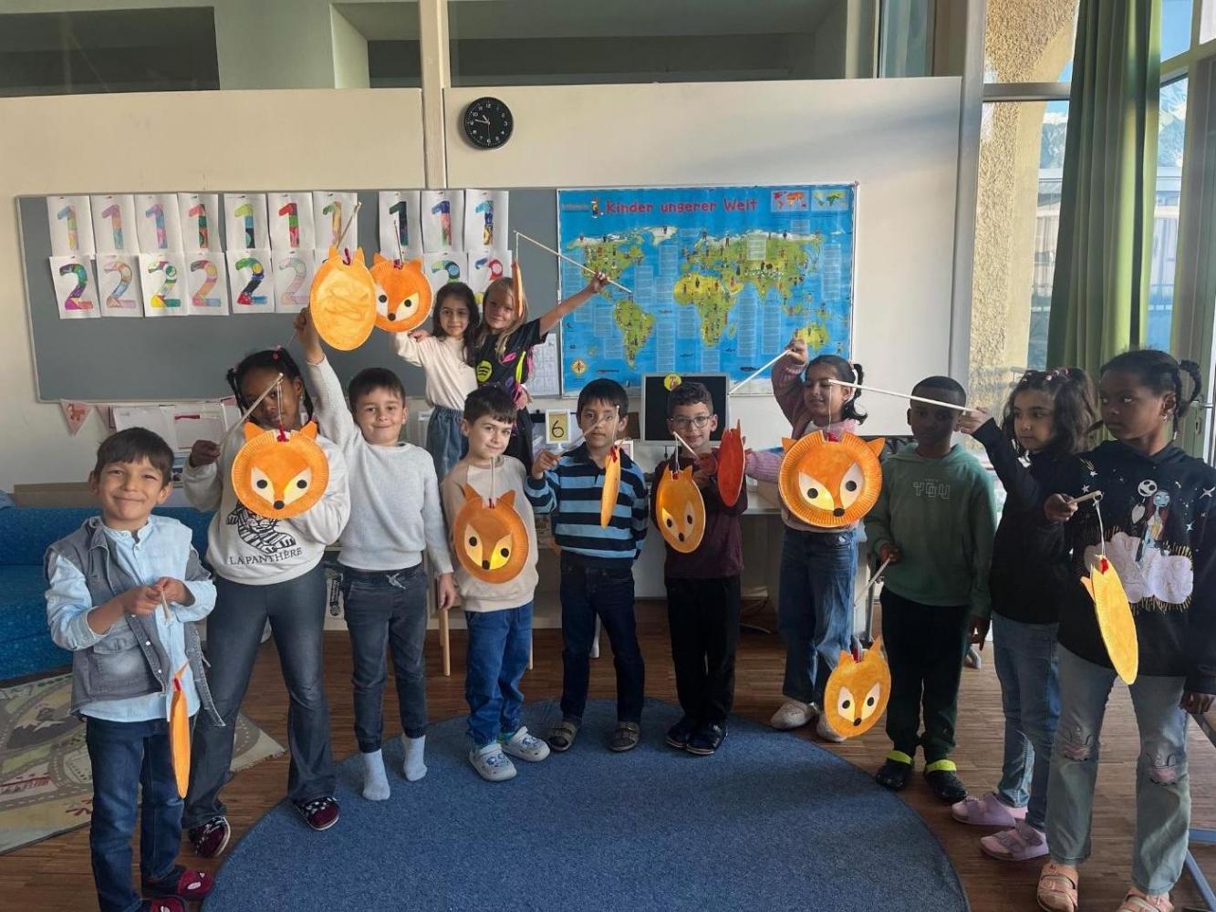 Am 12. November trafen sich die Deutsch Förderklasse, die Vorschule und die beiden ersten Klassen zu einem gemeinsamen Lichterfest. Wir zogen mit unseren selbstgebastelten Laternen durch den Park und durften Eltern und Geschwistern unsere Lieder vorsingen. Im Anschluss wärmten wir uns mit heißem Tee und Punsch im Schulhof.